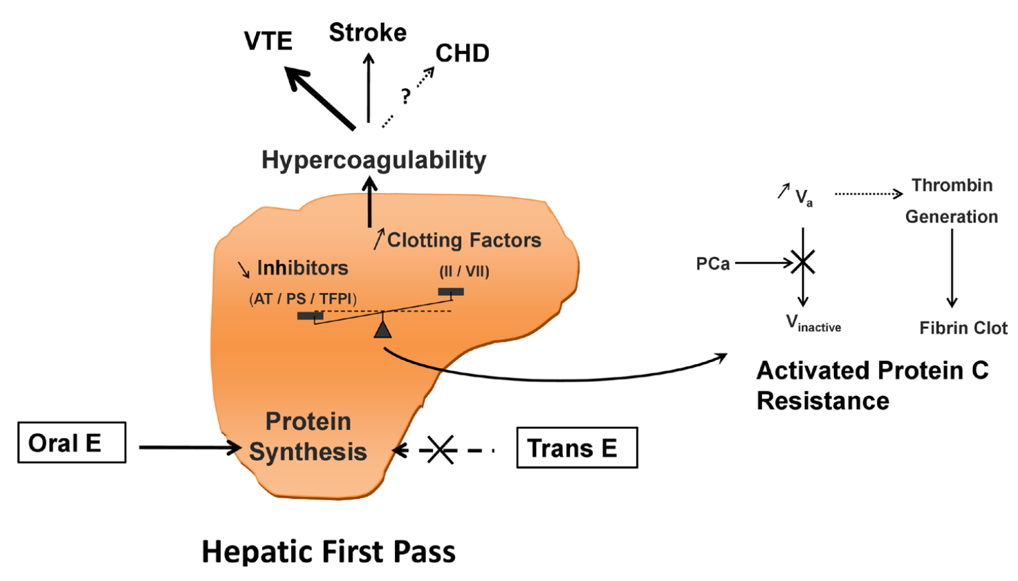 | Figure 1: Diagrammatic representation of increased coagulation via the liver first pass with oral estrogen therapy (Scarabin et al., 2020). Abbreviations: E = estrogen; trans = transdermal; AT = antithrombin; PS = protein S; TFPI = tissue factor protein inhibitor; II = prothrombin; VII = factor VII; PC = protein C; V = factor V; VTE = venous thromboembolism; CHD = coronary heart disease. Other terms: activated protein C resistance (APCR). |