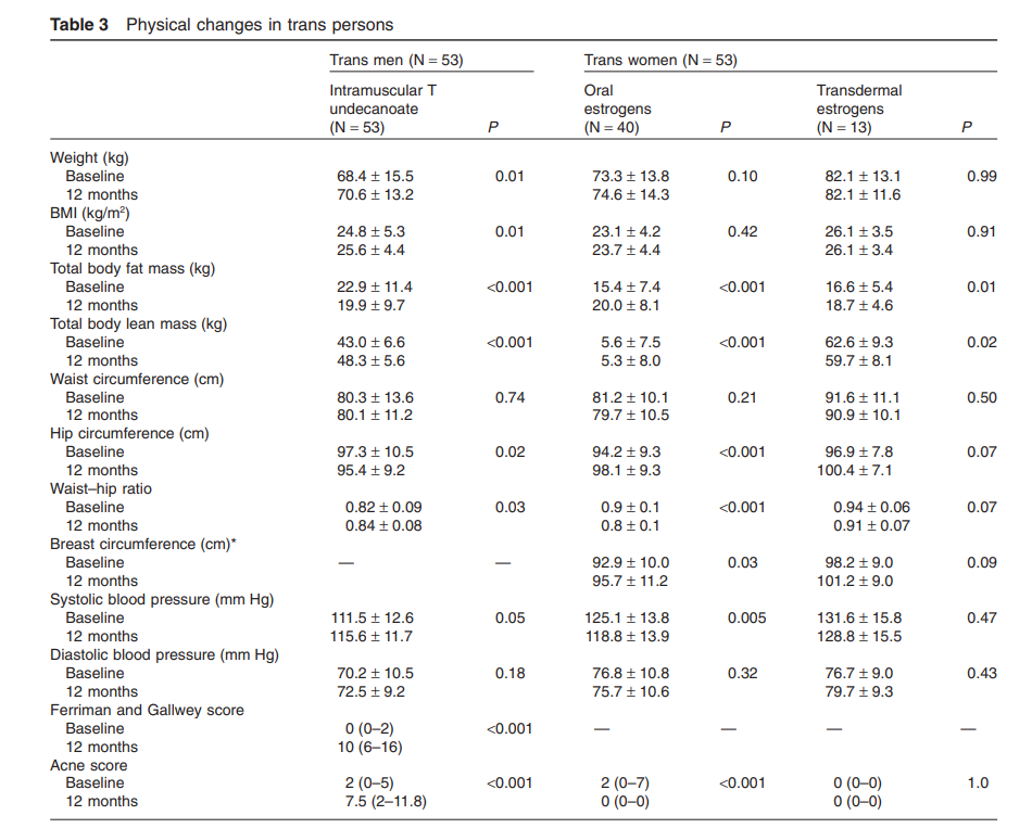 Antiandrogen with estrogen treatment resulted in a significant increase (average 3.3 cm) in breast circumference at the nipple, with a wide interindividual range of increase. Trans women using oral estrogens experienced similar changes in physical measures as those using transdermal estrogens (Table 3).