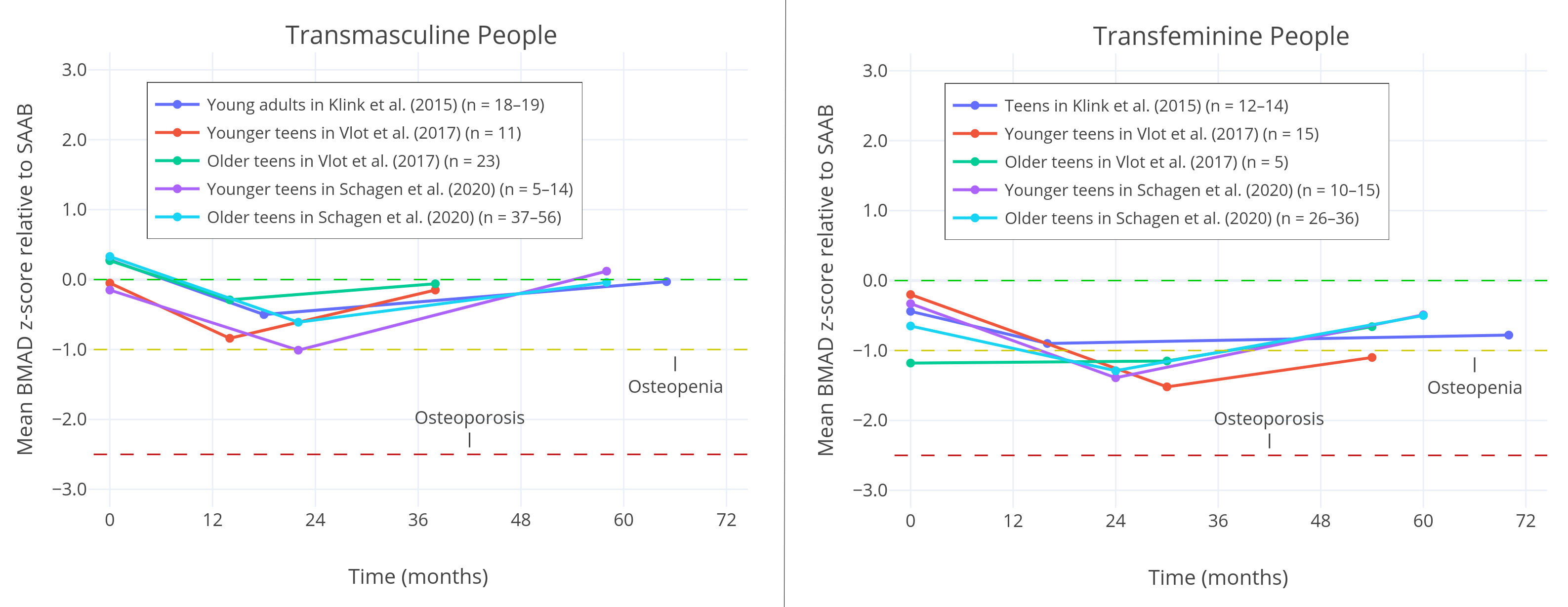 Vlot et al. (2017) finds that 2 years after beginning hormone therapy, z-scores were returning towards normal. In trans boys, final z-scores were negligibly lower, while in trans girls, the effect was much more pronounced, with meaningfully lower z-scores both before and after treatment.